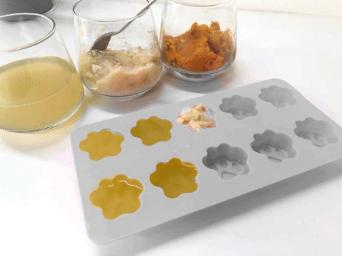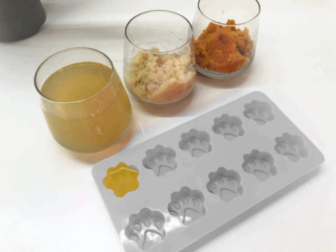 Finally, fill up the last few spots of the tray with pumpkin – rich in vitamin A to keep pupper’s sights clear!